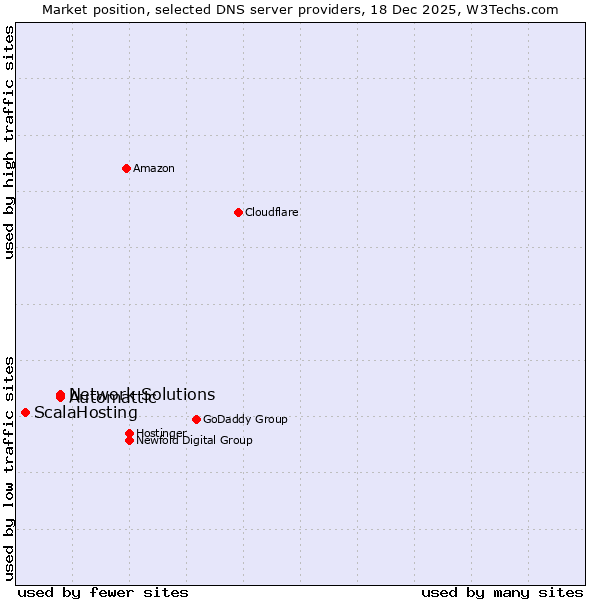 TechnologiesContent ManagementServer-side Languages Client-side Languages JavaScript Libraries CSS Frameworks Web Servers Web Panels Operating Systems Web Hosting Data Centers Reverse Proxies DNS Servers Email Servers SSL Certificate Authorities Content Delivery Traffic Analysis Tools Advertising Networks Tag Managers Social Widgets Site Elements Structured Data Markup Languages Character Encodings Image File Formats Top Level Domains Server Locations Content Languages | Technologies > DNS Servers > Technology usage comparison Comparison of the usage statistics of Automattic vs. Network Solutions vs. ScalaHosting for websitesThis report shows the usage statistics of Automattic vs. Network Solutions vs. ScalaHosting as DNS server provider on the web. See technologies overview for explanations on the methodologies used in the surveys. Our reports are updated daily. UsageThis diagram shows the percentages of websites using the selected technologies. How to read the diagram: