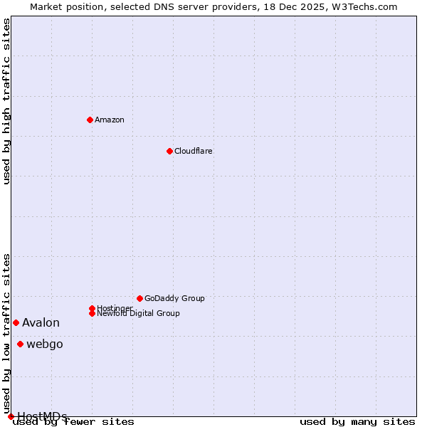 TechnologiesContent ManagementServer-side Languages Client-side Languages JavaScript Libraries CSS Frameworks Web Servers Web Panels Operating Systems Web Hosting Data Centers Reverse Proxies DNS Servers Email Servers SSL Certificate Authorities Content Delivery Traffic Analysis Tools Advertising Networks Tag Managers Social Widgets Site Elements Structured Data Markup Languages Character Encodings Image File Formats Top Level Domains Server Locations Content Languages | Technologies > DNS Servers > Technology usage comparison Comparison of the usage statistics of webgo vs. Avalon vs. HostMDs for websitesThis report shows the usage statistics of webgo vs. Avalon vs. HostMDs as DNS server provider on the web. See technologies overview for explanations on the methodologies used in the surveys. Our reports are updated daily. UsageThis diagram shows the percentages of websites using the selected technologies. How to read the diagram: