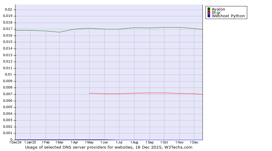 TechnologiesContent ManagementServer-side Languages Client-side Languages JavaScript Libraries CSS Frameworks Web Servers Web Panels Operating Systems Web Hosting Data Centers Reverse Proxies DNS Servers Email Servers SSL Certificate Authorities Content Delivery Traffic Analysis Tools Advertising Networks Tag Managers Social Widgets Site Elements Structured Data Markup Languages Character Encodings Image File Formats Top Level Domains Server Locations Content Languages | Technologies > DNS Servers > Technology usage comparison Comparison of the usage statistics of Avalon vs. IP.gr vs. Webhost Python for websitesThis report shows the usage statistics of Avalon vs. IP.gr vs. Webhost Python as DNS server provider on the web. See technologies overview for explanations on the methodologies used in the surveys. Our reports are updated daily. UsageThis diagram shows the percentages of websites using the selected technologies. How to read the diagram:
