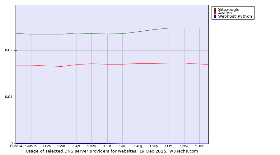 TechnologiesContent ManagementServer-side Languages Client-side Languages JavaScript Libraries CSS Frameworks Web Servers Web Panels Operating Systems Web Hosting Data Centers Reverse Proxies DNS Servers Email Servers SSL Certificate Authorities Content Delivery Traffic Analysis Tools Advertising Networks Tag Managers Social Widgets Site Elements Structured Data Markup Languages Character Encodings Image File Formats Top Level Domains Server Locations Content Languages | Technologies > DNS Servers > Technology usage comparison Comparison of the usage statistics of Sitezoogle vs. Avalon vs. Webhost Python for websitesThis report shows the usage statistics of Sitezoogle vs. Avalon vs. Webhost Python as DNS server provider on the web. See technologies overview for explanations on the methodologies used in the surveys. Our reports are updated daily. UsageThis diagram shows the percentages of websites using the selected technologies. How to read the diagram: