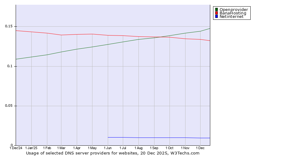 TechnologiesContent ManagementServer-side Languages Client-side Languages JavaScript Libraries CSS Frameworks Web Servers Web Panels Operating Systems Web Hosting Data Centers Reverse Proxies DNS Servers Email Servers SSL Certificate Authorities Content Delivery Traffic Analysis Tools Advertising Networks Tag Managers Social Widgets Site Elements Structured Data Markup Languages Character Encodings Image File Formats Top Level Domains Server Locations Content Languages | Technologies > DNS Servers > Technology usage comparison Comparison of the usage statistics of Openprovider vs. BanaHosting vs. Netinternet for websitesThis report shows the usage statistics of Openprovider vs. BanaHosting vs. Netinternet as DNS server provider on the web. See technologies overview for explanations on the methodologies used in the surveys. Our reports are updated daily. UsageThis diagram shows the percentages of websites using the selected technologies. How to read the diagram:
