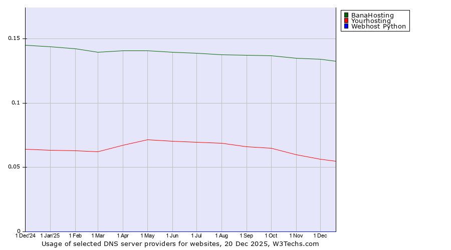 TechnologiesContent ManagementServer-side Languages Client-side Languages JavaScript Libraries CSS Frameworks Web Servers Web Panels Operating Systems Web Hosting Data Centers Reverse Proxies DNS Servers Email Servers SSL Certificate Authorities Content Delivery Traffic Analysis Tools Advertising Networks Tag Managers Social Widgets Site Elements Structured Data Markup Languages Character Encodings Image File Formats Top Level Domains Server Locations Content Languages | Technologies > DNS Servers > Technology usage comparison Comparison of the usage statistics of BanaHosting vs. Yourhosting vs. Webhost Python for websitesThis report shows the usage statistics of BanaHosting vs. Yourhosting vs. Webhost Python as DNS server provider on the web. See technologies overview for explanations on the methodologies used in the surveys. Our reports are updated daily. UsageThis diagram shows the percentages of websites using the selected technologies. How to read the diagram: