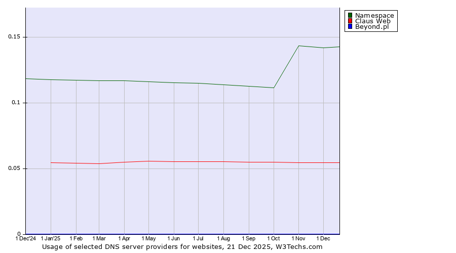 TechnologiesContent ManagementServer-side Languages Client-side Languages JavaScript Libraries CSS Frameworks Web Servers Web Panels Operating Systems Web Hosting Data Centers Reverse Proxies DNS Servers Email Servers SSL Certificate Authorities Content Delivery Traffic Analysis Tools Advertising Networks Tag Managers Social Widgets Site Elements Structured Data Markup Languages Character Encodings Image File Formats Top Level Domains Server Locations Content Languages | Technologies > DNS Servers > Technology usage comparison Comparison of the usage statistics of Namespace vs. Claus Web vs. Beyond.pl for websitesThis report shows the usage statistics of Namespace vs. Claus Web vs. Beyond.pl as DNS server provider on the web. See technologies overview for explanations on the methodologies used in the surveys. Our reports are updated daily. UsageThis diagram shows the percentages of websites using the selected technologies. How to read the diagram: