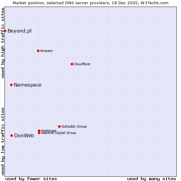 TechnologiesContent ManagementServer-side Languages Client-side Languages JavaScript Libraries CSS Frameworks Web Servers Web Panels Operating Systems Web Hosting Data Centers Reverse Proxies DNS Servers Email Servers SSL Certificate Authorities Content Delivery Traffic Analysis Tools Advertising Networks Tag Managers Social Widgets Site Elements Structured Data Markup Languages Character Encodings Image File Formats Top Level Domains Server Locations Content Languages | Technologies > DNS Servers > Technology usage comparison Comparison of the usage statistics of DonWeb vs. Namespace vs. Beyond.pl for websitesThis report shows the usage statistics of DonWeb vs. Namespace vs. Beyond.pl as DNS server provider on the web. See technologies overview for explanations on the methodologies used in the surveys. Our reports are updated daily. UsageThis diagram shows the percentages of websites using the selected technologies. How to read the diagram: