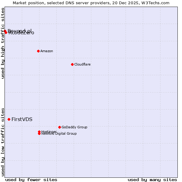 TechnologiesContent ManagementServer-side Languages Client-side Languages JavaScript Libraries CSS Frameworks Web Servers Web Panels Operating Systems Web Hosting Data Centers Reverse Proxies DNS Servers Email Servers SSL Certificate Authorities Content Delivery Traffic Analysis Tools Advertising Networks Tag Managers Social Widgets Site Elements Structured Data Markup Languages Character Encodings Image File Formats Top Level Domains Server Locations Content Languages | Technologies > DNS Servers > Technology usage comparison Comparison of the usage statistics of FirstVDS vs. RcodeZero vs. Beyond.pl for websitesThis report shows the usage statistics of FirstVDS vs. RcodeZero vs. Beyond.pl as DNS server provider on the web. See technologies overview for explanations on the methodologies used in the surveys. Our reports are updated daily. UsageThis diagram shows the percentages of websites using the selected technologies. How to read the diagram: