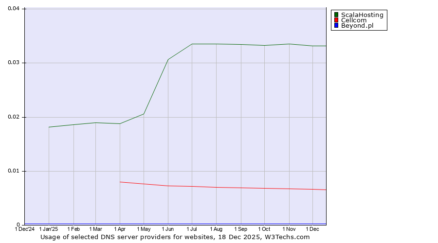 TechnologiesContent ManagementServer-side Languages Client-side Languages JavaScript Libraries CSS Frameworks Web Servers Web Panels Operating Systems Web Hosting Data Centers Reverse Proxies DNS Servers Email Servers SSL Certificate Authorities Content Delivery Traffic Analysis Tools Advertising Networks Tag Managers Social Widgets Site Elements Structured Data Markup Languages Character Encodings Image File Formats Top Level Domains Server Locations Content Languages | Technologies > DNS Servers > Technology usage comparison Comparison of the usage statistics of ScalaHosting vs. Cellcom vs. Beyond.pl for websitesThis report shows the usage statistics of ScalaHosting vs. Cellcom vs. Beyond.pl as DNS server provider on the web. See technologies overview for explanations on the methodologies used in the surveys. Our reports are updated daily. UsageThis diagram shows the percentages of websites using the selected technologies. How to read the diagram: