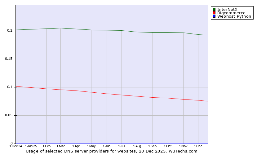 TechnologiesContent ManagementServer-side Languages Client-side Languages JavaScript Libraries CSS Frameworks Web Servers Web Panels Operating Systems Web Hosting Data Centers Reverse Proxies DNS Servers Email Servers SSL Certificate Authorities Content Delivery Traffic Analysis Tools Advertising Networks Tag Managers Social Widgets Site Elements Structured Data Markup Languages Character Encodings Image File Formats Top Level Domains Server Locations Content Languages | Technologies > DNS Servers > Technology usage comparison Comparison of the usage statistics of InterNetX vs. Bigcommerce vs. Webhost Python for websitesThis report shows the usage statistics of InterNetX vs. Bigcommerce vs. Webhost Python as DNS server provider on the web. See technologies overview for explanations on the methodologies used in the surveys. Our reports are updated daily. UsageThis diagram shows the percentages of websites using the selected technologies. How to read the diagram: