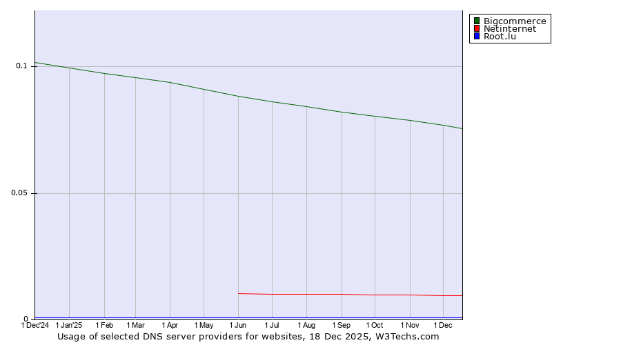 TechnologiesContent ManagementServer-side Languages Client-side Languages JavaScript Libraries CSS Frameworks Web Servers Web Panels Operating Systems Web Hosting Data Centers Reverse Proxies DNS Servers Email Servers SSL Certificate Authorities Content Delivery Traffic Analysis Tools Advertising Networks Tag Managers Social Widgets Site Elements Structured Data Markup Languages Character Encodings Image File Formats Top Level Domains Server Locations Content Languages | Technologies > DNS Servers > Technology usage comparison Comparison of the usage statistics of Bigcommerce vs. Netinternet vs. Root.lu for websitesThis report shows the usage statistics of Bigcommerce vs. Netinternet vs. Root.lu as DNS server provider on the web. See technologies overview for explanations on the methodologies used in the surveys. Our reports are updated daily. UsageThis diagram shows the percentages of websites using the selected technologies. How to read the diagram: