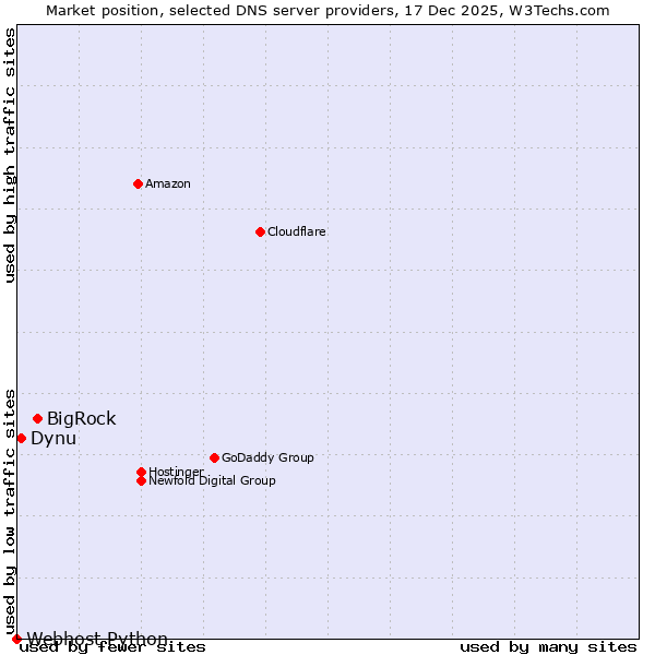 TechnologiesContent ManagementServer-side Languages Client-side Languages JavaScript Libraries CSS Frameworks Web Servers Web Panels Operating Systems Web Hosting Data Centers Reverse Proxies DNS Servers Email Servers SSL Certificate Authorities Content Delivery Traffic Analysis Tools Advertising Networks Tag Managers Social Widgets Site Elements Structured Data Markup Languages Character Encodings Image File Formats Top Level Domains Server Locations Content Languages | Technologies > DNS Servers > Technology usage comparison Comparison of the usage statistics of BigRock vs. Dynu vs. Webhost Python for websitesThis report shows the usage statistics of BigRock vs. Dynu vs. Webhost Python as DNS server provider on the web. See technologies overview for explanations on the methodologies used in the surveys. Our reports are updated daily. UsageThis diagram shows the percentages of websites using the selected technologies. How to read the diagram: