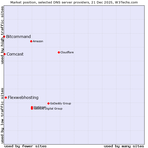 TechnologiesContent ManagementServer-side Languages Client-side Languages JavaScript Libraries CSS Frameworks Web Servers Web Panels Operating Systems Web Hosting Data Centers Reverse Proxies DNS Servers Email Servers SSL Certificate Authorities Content Delivery Traffic Analysis Tools Advertising Networks Tag Managers Social Widgets Site Elements Structured Data Markup Languages Character Encodings Image File Formats Top Level Domains Server Locations Content Languages | Technologies > DNS Servers > Technology usage comparison Comparison of the usage statistics of Flexwebhosting vs. Comcast vs. Bitcommand for websitesThis report shows the usage statistics of Flexwebhosting vs. Comcast vs. Bitcommand as DNS server provider on the web. See technologies overview for explanations on the methodologies used in the surveys. Our reports are updated daily. UsageThis diagram shows the percentages of websites using the selected technologies. How to read the diagram: