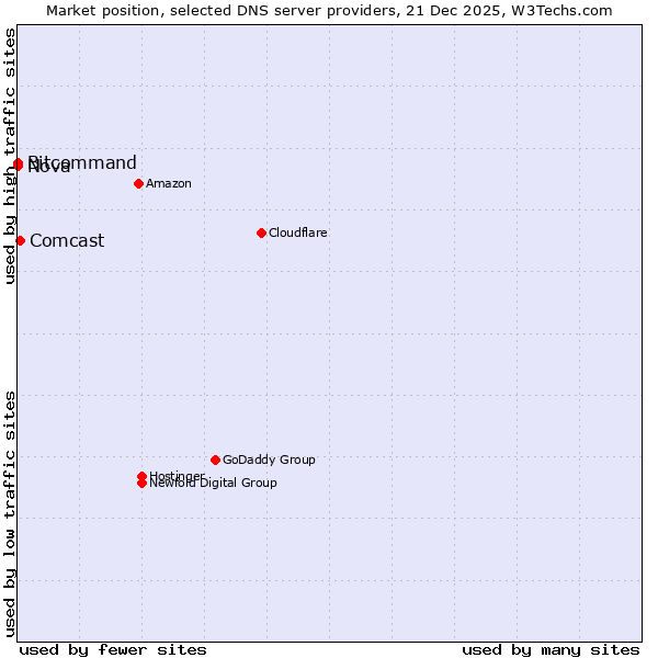 TechnologiesContent ManagementServer-side Languages Client-side Languages JavaScript Libraries CSS Frameworks Web Servers Web Panels Operating Systems Web Hosting Data Centers Reverse Proxies DNS Servers Email Servers SSL Certificate Authorities Content Delivery Traffic Analysis Tools Advertising Networks Tag Managers Social Widgets Site Elements Structured Data Markup Languages Character Encodings Image File Formats Top Level Domains Server Locations Content Languages | Technologies > DNS Servers > Technology usage comparison Comparison of the usage statistics of Comcast vs. Bitcommand vs. Nova for websitesThis report shows the usage statistics of Comcast vs. Bitcommand vs. Nova as DNS server provider on the web. See technologies overview for explanations on the methodologies used in the surveys. Our reports are updated daily. UsageThis diagram shows the percentages of websites using the selected technologies. How to read the diagram: