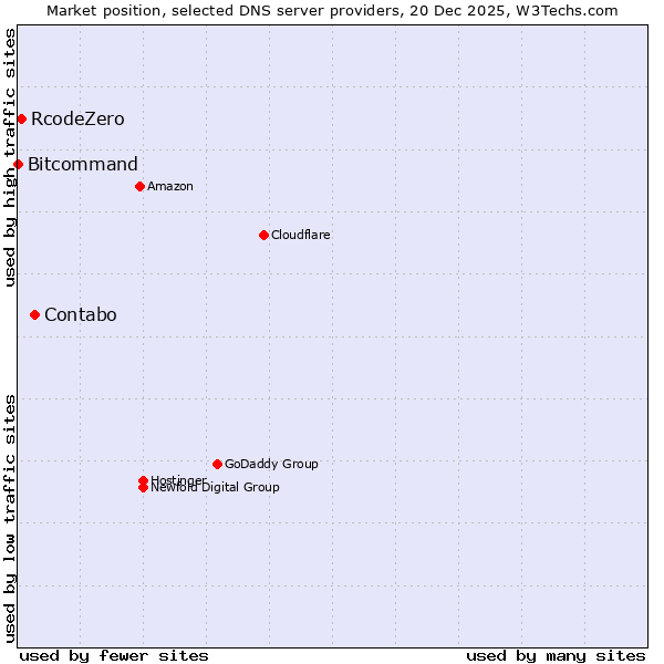 TechnologiesContent ManagementServer-side Languages Client-side Languages JavaScript Libraries CSS Frameworks Web Servers Web Panels Operating Systems Web Hosting Data Centers Reverse Proxies DNS Servers Email Servers SSL Certificate Authorities Content Delivery Traffic Analysis Tools Advertising Networks Tag Managers Social Widgets Site Elements Structured Data Markup Languages Character Encodings Image File Formats Top Level Domains Server Locations Content Languages | Technologies > DNS Servers > Technology usage comparison Comparison of the usage statistics of Contabo vs. RcodeZero vs. Bitcommand for websitesThis report shows the usage statistics of Contabo vs. RcodeZero vs. Bitcommand as DNS server provider on the web. See technologies overview for explanations on the methodologies used in the surveys. Our reports are updated daily. UsageThis diagram shows the percentages of websites using the selected technologies. How to read the diagram: