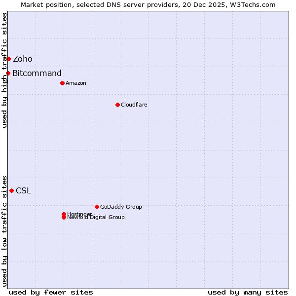 TechnologiesContent ManagementServer-side Languages Client-side Languages JavaScript Libraries CSS Frameworks Web Servers Web Panels Operating Systems Web Hosting Data Centers Reverse Proxies DNS Servers Email Servers SSL Certificate Authorities Content Delivery Traffic Analysis Tools Advertising Networks Tag Managers Social Widgets Site Elements Structured Data Markup Languages Character Encodings Image File Formats Top Level Domains Server Locations Content Languages | Technologies > DNS Servers > Technology usage comparison Comparison of the usage statistics of CSL vs. Zoho vs. Bitcommand for websitesThis report shows the usage statistics of CSL vs. Zoho vs. Bitcommand as DNS server provider on the web. See technologies overview for explanations on the methodologies used in the surveys. Our reports are updated daily. UsageThis diagram shows the percentages of websites using the selected technologies. How to read the diagram: