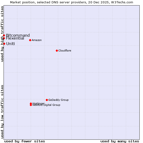 TechnologiesContent ManagementServer-side Languages Client-side Languages JavaScript Libraries CSS Frameworks Web Servers Web Panels Operating Systems Web Hosting Data Centers Reverse Proxies DNS Servers Email Servers SSL Certificate Authorities Content Delivery Traffic Analysis Tools Advertising Networks Tag Managers Social Widgets Site Elements Structured Data Markup Languages Character Encodings Image File Formats Top Level Domains Server Locations Content Languages | Technologies > DNS Servers > Technology usage comparison Comparison of the usage statistics of Uniti vs. Bitcommand vs. Flexential for websitesThis report shows the usage statistics of Uniti vs. Bitcommand vs. Flexential as DNS server provider on the web. See technologies overview for explanations on the methodologies used in the surveys. Our reports are updated daily. UsageThis diagram shows the percentages of websites using the selected technologies. How to read the diagram:
