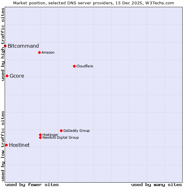 TechnologiesContent ManagementServer-side Languages Client-side Languages JavaScript Libraries CSS Frameworks Web Servers Web Panels Operating Systems Web Hosting Data Centers Reverse Proxies DNS Servers Email Servers SSL Certificate Authorities Content Delivery Traffic Analysis Tools Advertising Networks Tag Managers Social Widgets Site Elements Structured Data Markup Languages Character Encodings Image File Formats Top Level Domains Server Locations Content Languages | Technologies > DNS Servers > Technology usage comparison Comparison of the usage statistics of Gcore vs. Hostinet vs. Bitcommand for websitesThis report shows the usage statistics of Gcore vs. Hostinet vs. Bitcommand as DNS server provider on the web. See technologies overview for explanations on the methodologies used in the surveys. Our reports are updated daily. UsageThis diagram shows the percentages of websites using the selected technologies. How to read the diagram: