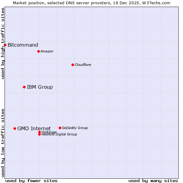 TechnologiesContent ManagementServer-side Languages Client-side Languages JavaScript Libraries CSS Frameworks Web Servers Web Panels Operating Systems Web Hosting Data Centers Reverse Proxies DNS Servers Email Servers SSL Certificate Authorities Content Delivery Traffic Analysis Tools Advertising Networks Tag Managers Social Widgets Site Elements Structured Data Markup Languages Character Encodings Image File Formats Top Level Domains Server Locations Content Languages | Technologies > DNS Servers > Technology usage comparison Comparison of the usage statistics of IBM Group vs. GMO Internet vs. Bitcommand for websitesThis report shows the usage statistics of IBM Group vs. GMO Internet vs. Bitcommand as DNS server provider on the web. See technologies overview for explanations on the methodologies used in the surveys. Our reports are updated daily. UsageThis diagram shows the percentages of websites using the selected technologies. How to read the diagram: