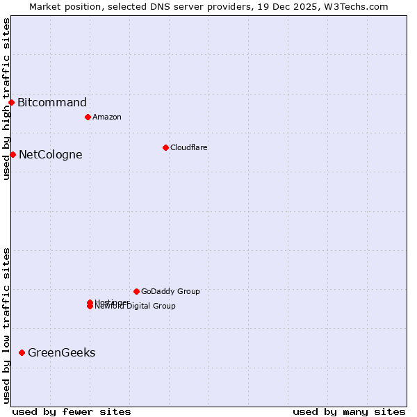 TechnologiesContent ManagementServer-side Languages Client-side Languages JavaScript Libraries CSS Frameworks Web Servers Web Panels Operating Systems Web Hosting Data Centers Reverse Proxies DNS Servers Email Servers SSL Certificate Authorities Content Delivery Traffic Analysis Tools Advertising Networks Tag Managers Social Widgets Site Elements Structured Data Markup Languages Character Encodings Image File Formats Top Level Domains Server Locations Content Languages | Technologies > DNS Servers > Technology usage comparison Comparison of the usage statistics of GreenGeeks vs. NetCologne vs. Bitcommand for websitesThis report shows the usage statistics of GreenGeeks vs. NetCologne vs. Bitcommand as DNS server provider on the web. See technologies overview for explanations on the methodologies used in the surveys. Our reports are updated daily. UsageThis diagram shows the percentages of websites using the selected technologies. How to read the diagram:
