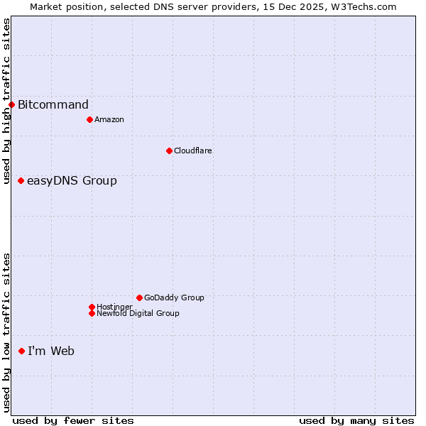 TechnologiesContent ManagementServer-side Languages Client-side Languages JavaScript Libraries CSS Frameworks Web Servers Web Panels Operating Systems Web Hosting Data Centers Reverse Proxies DNS Servers Email Servers SSL Certificate Authorities Content Delivery Traffic Analysis Tools Advertising Networks Tag Managers Social Widgets Site Elements Structured Data Markup Languages Character Encodings Image File Formats Top Level Domains Server Locations Content Languages | Technologies > DNS Servers > Technology usage comparison Comparison of the usage statistics of I'm Web vs. easyDNS Group vs. Bitcommand for websitesThis report shows the usage statistics of I'm Web vs. easyDNS Group vs. Bitcommand as DNS server provider on the web. See technologies overview for explanations on the methodologies used in the surveys. Our reports are updated daily. UsageThis diagram shows the percentages of websites using the selected technologies. How to read the diagram: