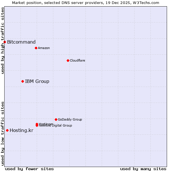 TechnologiesContent ManagementServer-side Languages Client-side Languages JavaScript Libraries CSS Frameworks Web Servers Web Panels Operating Systems Web Hosting Data Centers Reverse Proxies DNS Servers Email Servers SSL Certificate Authorities Content Delivery Traffic Analysis Tools Advertising Networks Tag Managers Social Widgets Site Elements Structured Data Markup Languages Character Encodings Image File Formats Top Level Domains Server Locations Content Languages | Technologies > DNS Servers > Technology usage comparison Comparison of the usage statistics of IBM Group vs. Hosting.kr vs. Bitcommand for websitesThis report shows the usage statistics of IBM Group vs. Hosting.kr vs. Bitcommand as DNS server provider on the web. See technologies overview for explanations on the methodologies used in the surveys. Our reports are updated daily. UsageThis diagram shows the percentages of websites using the selected technologies. How to read the diagram: