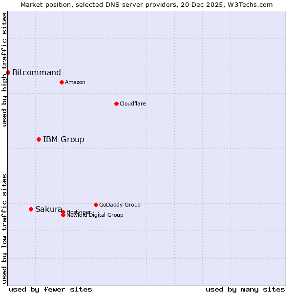 TechnologiesContent ManagementServer-side Languages Client-side Languages JavaScript Libraries CSS Frameworks Web Servers Web Panels Operating Systems Web Hosting Data Centers Reverse Proxies DNS Servers Email Servers SSL Certificate Authorities Content Delivery Traffic Analysis Tools Advertising Networks Tag Managers Social Widgets Site Elements Structured Data Markup Languages Character Encodings Image File Formats Top Level Domains Server Locations Content Languages | Technologies > DNS Servers > Technology usage comparison Comparison of the usage statistics of IBM Group vs. Sakura vs. Bitcommand for websitesThis report shows the usage statistics of IBM Group vs. Sakura vs. Bitcommand as DNS server provider on the web. See technologies overview for explanations on the methodologies used in the surveys. Our reports are updated daily. UsageThis diagram shows the percentages of websites using the selected technologies. How to read the diagram: