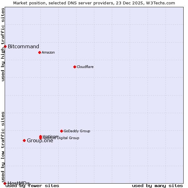 TechnologiesContent ManagementServer-side Languages Client-side Languages JavaScript Libraries CSS Frameworks Web Servers Web Panels Operating Systems Web Hosting Data Centers Reverse Proxies DNS Servers Email Servers SSL Certificate Authorities Content Delivery Traffic Analysis Tools Advertising Networks Tag Managers Social Widgets Site Elements Structured Data Markup Languages Character Encodings Image File Formats Top Level Domains Server Locations Content Languages | Technologies > DNS Servers > Technology usage comparison Comparison of the usage statistics of Group.one vs. Bitcommand vs. HostMDs for websitesThis report shows the usage statistics of Group.one vs. Bitcommand vs. HostMDs as DNS server provider on the web. See technologies overview for explanations on the methodologies used in the surveys. Our reports are updated daily. UsageThis diagram shows the percentages of websites using the selected technologies. How to read the diagram: