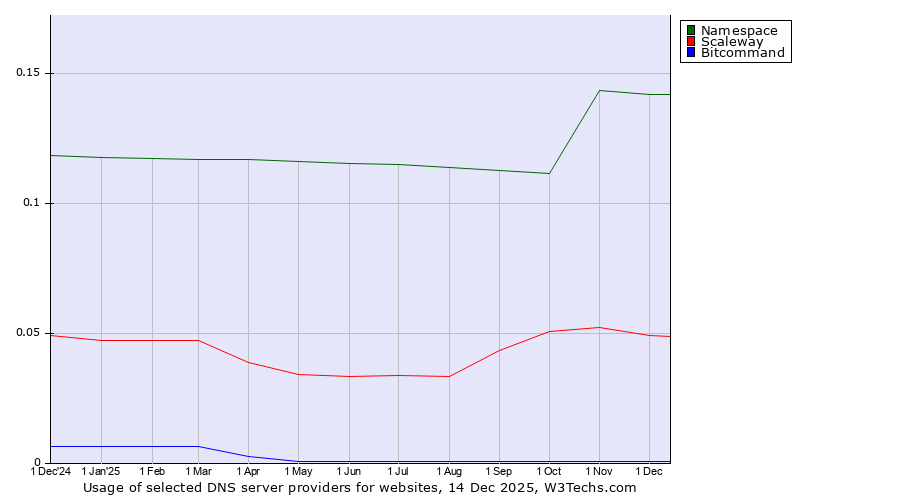 TechnologiesContent ManagementServer-side Languages Client-side Languages JavaScript Libraries CSS Frameworks Web Servers Web Panels Operating Systems Web Hosting Data Centers Reverse Proxies DNS Servers Email Servers SSL Certificate Authorities Content Delivery Traffic Analysis Tools Advertising Networks Tag Managers Social Widgets Site Elements Structured Data Markup Languages Character Encodings Image File Formats Top Level Domains Server Locations Content Languages | Technologies > DNS Servers > Technology usage comparison Comparison of the usage statistics of Namespace vs. Scaleway vs. Bitcommand for websitesThis report shows the usage statistics of Namespace vs. Scaleway vs. Bitcommand as DNS server provider on the web. See technologies overview for explanations on the methodologies used in the surveys. Our reports are updated daily. UsageThis diagram shows the percentages of websites using the selected technologies. How to read the diagram: