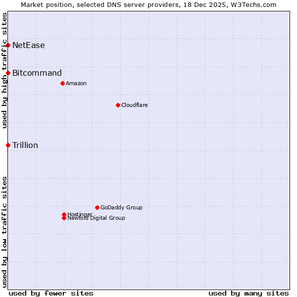 TechnologiesContent ManagementServer-side Languages Client-side Languages JavaScript Libraries CSS Frameworks Web Servers Web Panels Operating Systems Web Hosting Data Centers Reverse Proxies DNS Servers Email Servers SSL Certificate Authorities Content Delivery Traffic Analysis Tools Advertising Networks Tag Managers Social Widgets Site Elements Structured Data Markup Languages Character Encodings Image File Formats Top Level Domains Server Locations Content Languages | Technologies > DNS Servers > Technology usage comparison Comparison of the usage statistics of Bitcommand vs. NetEase vs. Trillion for websitesThis report shows the usage statistics of Bitcommand vs. NetEase vs. Trillion as DNS server provider on the web. See technologies overview for explanations on the methodologies used in the surveys. Our reports are updated daily. UsageThis diagram shows the percentages of websites using the selected technologies. How to read the diagram: