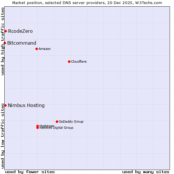 TechnologiesContent ManagementServer-side Languages Client-side Languages JavaScript Libraries CSS Frameworks Web Servers Web Panels Operating Systems Web Hosting Data Centers Reverse Proxies DNS Servers Email Servers SSL Certificate Authorities Content Delivery Traffic Analysis Tools Advertising Networks Tag Managers Social Widgets Site Elements Structured Data Markup Languages Character Encodings Image File Formats Top Level Domains Server Locations Content Languages | Technologies > DNS Servers > Technology usage comparison Comparison of the usage statistics of RcodeZero vs. Nimbus Hosting vs. Bitcommand for websitesThis report shows the usage statistics of RcodeZero vs. Nimbus Hosting vs. Bitcommand as DNS server provider on the web. See technologies overview for explanations on the methodologies used in the surveys. Our reports are updated daily. UsageThis diagram shows the percentages of websites using the selected technologies. How to read the diagram: