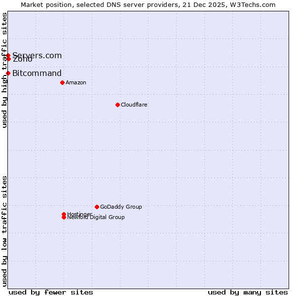 TechnologiesContent ManagementServer-side Languages Client-side Languages JavaScript Libraries CSS Frameworks Web Servers Web Panels Operating Systems Web Hosting Data Centers Reverse Proxies DNS Servers Email Servers SSL Certificate Authorities Content Delivery Traffic Analysis Tools Advertising Networks Tag Managers Social Widgets Site Elements Structured Data Markup Languages Character Encodings Image File Formats Top Level Domains Server Locations Content Languages | Technologies > DNS Servers > Technology usage comparison Comparison of the usage statistics of Zoho vs. Bitcommand vs. Servers.com for websitesThis report shows the usage statistics of Zoho vs. Bitcommand vs. Servers.com as DNS server provider on the web. See technologies overview for explanations on the methodologies used in the surveys. Our reports are updated daily. UsageThis diagram shows the percentages of websites using the selected technologies. How to read the diagram:
