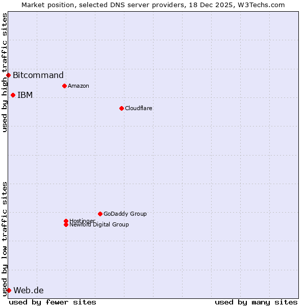 TechnologiesContent ManagementServer-side Languages Client-side Languages JavaScript Libraries CSS Frameworks Web Servers Web Panels Operating Systems Web Hosting Data Centers Reverse Proxies DNS Servers Email Servers SSL Certificate Authorities Content Delivery Traffic Analysis Tools Advertising Networks Tag Managers Social Widgets Site Elements Structured Data Markup Languages Character Encodings Image File Formats Top Level Domains Server Locations Content Languages | Technologies > DNS Servers > Technology usage comparison Comparison of the usage statistics of IBM vs. Web.de vs. Bitcommand for websitesThis report shows the usage statistics of IBM vs. Web.de vs. Bitcommand as DNS server provider on the web. See technologies overview for explanations on the methodologies used in the surveys. Our reports are updated daily. UsageThis diagram shows the percentages of websites using the selected technologies. How to read the diagram: