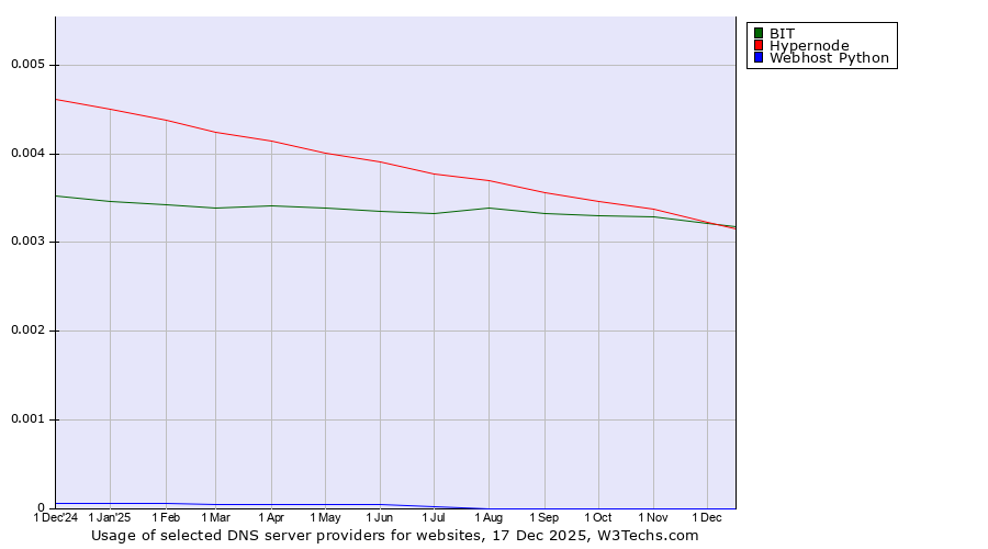 TechnologiesContent ManagementServer-side Languages Client-side Languages JavaScript Libraries CSS Frameworks Web Servers Web Panels Operating Systems Web Hosting Data Centers Reverse Proxies DNS Servers Email Servers SSL Certificate Authorities Content Delivery Traffic Analysis Tools Advertising Networks Tag Managers Social Widgets Site Elements Structured Data Markup Languages Character Encodings Image File Formats Top Level Domains Server Locations Content Languages | Technologies > DNS Servers > Technology usage comparison Comparison of the usage statistics of BIT vs. Hypernode vs. Webhost Python for websitesThis report shows the usage statistics of BIT vs. Hypernode vs. Webhost Python as DNS server provider on the web. See technologies overview for explanations on the methodologies used in the surveys. Our reports are updated daily. UsageThis diagram shows the percentages of websites using the selected technologies. How to read the diagram: