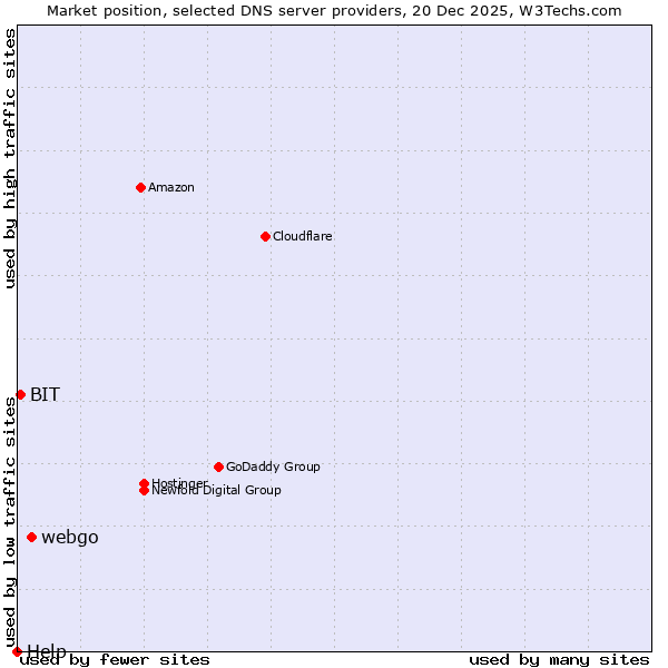 TechnologiesContent ManagementServer-side Languages Client-side Languages JavaScript Libraries CSS Frameworks Web Servers Web Panels Operating Systems Web Hosting Data Centers Reverse Proxies DNS Servers Email Servers SSL Certificate Authorities Content Delivery Traffic Analysis Tools Advertising Networks Tag Managers Social Widgets Site Elements Structured Data Markup Languages Character Encodings Image File Formats Top Level Domains Server Locations Content Languages | Technologies > DNS Servers > Technology usage comparison Comparison of the usage statistics of webgo vs. BIT vs. Help for websitesThis report shows the usage statistics of webgo vs. BIT vs. Help as DNS server provider on the web. See technologies overview for explanations on the methodologies used in the surveys. Our reports are updated daily. UsageThis diagram shows the percentages of websites using the selected technologies. How to read the diagram: