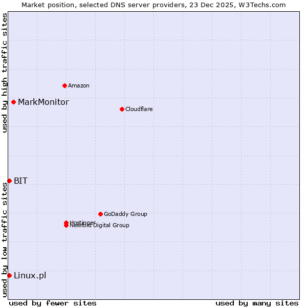 TechnologiesContent ManagementServer-side Languages Client-side Languages JavaScript Libraries CSS Frameworks Web Servers Web Panels Operating Systems Web Hosting Data Centers Reverse Proxies DNS Servers Email Servers SSL Certificate Authorities Content Delivery Traffic Analysis Tools Advertising Networks Tag Managers Social Widgets Site Elements Structured Data Markup Languages Character Encodings Image File Formats Top Level Domains Server Locations Content Languages | Technologies > DNS Servers > Technology usage comparison Comparison of the usage statistics of MarkMonitor vs. BIT vs. Linux.pl for websitesThis report shows the usage statistics of MarkMonitor vs. BIT vs. Linux.pl as DNS server provider on the web. See technologies overview for explanations on the methodologies used in the surveys. Our reports are updated daily. UsageThis diagram shows the percentages of websites using the selected technologies. How to read the diagram: