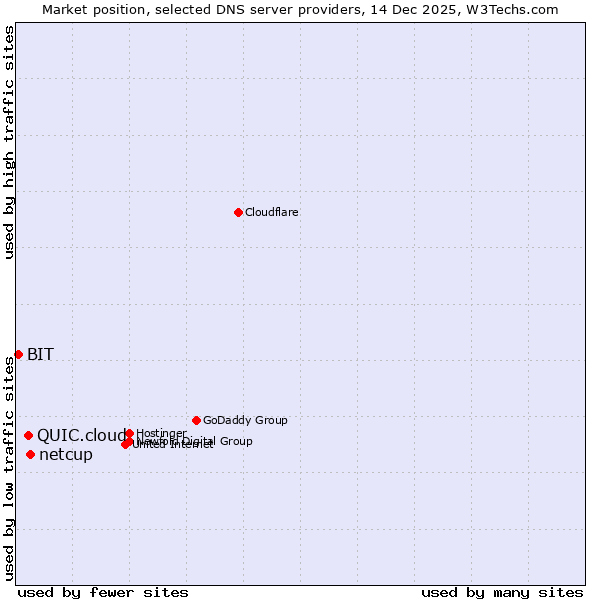 TechnologiesContent ManagementServer-side Languages Client-side Languages JavaScript Libraries CSS Frameworks Web Servers Web Panels Operating Systems Web Hosting Data Centers Reverse Proxies DNS Servers Email Servers SSL Certificate Authorities Content Delivery Traffic Analysis Tools Advertising Networks Tag Managers Social Widgets Site Elements Structured Data Markup Languages Character Encodings Image File Formats Top Level Domains Server Locations Content Languages | Technologies > DNS Servers > Technology usage comparison Comparison of the usage statistics of netcup vs. QUIC.cloud vs. BIT for websitesThis report shows the usage statistics of netcup vs. QUIC.cloud vs. BIT as DNS server provider on the web. See technologies overview for explanations on the methodologies used in the surveys. Our reports are updated daily. UsageThis diagram shows the percentages of websites using the selected technologies. How to read the diagram: