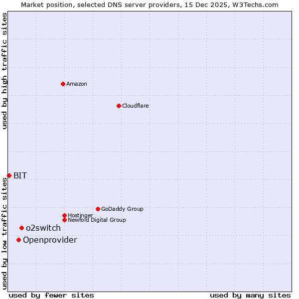 TechnologiesContent ManagementServer-side Languages Client-side Languages JavaScript Libraries CSS Frameworks Web Servers Web Panels Operating Systems Web Hosting Data Centers Reverse Proxies DNS Servers Email Servers SSL Certificate Authorities Content Delivery Traffic Analysis Tools Advertising Networks Tag Managers Social Widgets Site Elements Structured Data Markup Languages Character Encodings Image File Formats Top Level Domains Server Locations Content Languages | Technologies > DNS Servers > Technology usage comparison Comparison of the usage statistics of o2switch vs. Openprovider vs. BIT for websitesThis report shows the usage statistics of o2switch vs. Openprovider vs. BIT as DNS server provider on the web. See technologies overview for explanations on the methodologies used in the surveys. Our reports are updated daily. UsageThis diagram shows the percentages of websites using the selected technologies. How to read the diagram: