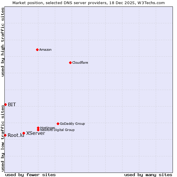 TechnologiesContent ManagementServer-side Languages Client-side Languages JavaScript Libraries CSS Frameworks Web Servers Web Panels Operating Systems Web Hosting Data Centers Reverse Proxies DNS Servers Email Servers SSL Certificate Authorities Content Delivery Traffic Analysis Tools Advertising Networks Tag Managers Social Widgets Site Elements Structured Data Markup Languages Character Encodings Image File Formats Top Level Domains Server Locations Content Languages | Technologies > DNS Servers > Technology usage comparison Comparison of the usage statistics of XServer vs. BIT vs. Root.lu for websitesThis report shows the usage statistics of XServer vs. BIT vs. Root.lu as DNS server provider on the web. See technologies overview for explanations on the methodologies used in the surveys. Our reports are updated daily. UsageThis diagram shows the percentages of websites using the selected technologies. How to read the diagram: