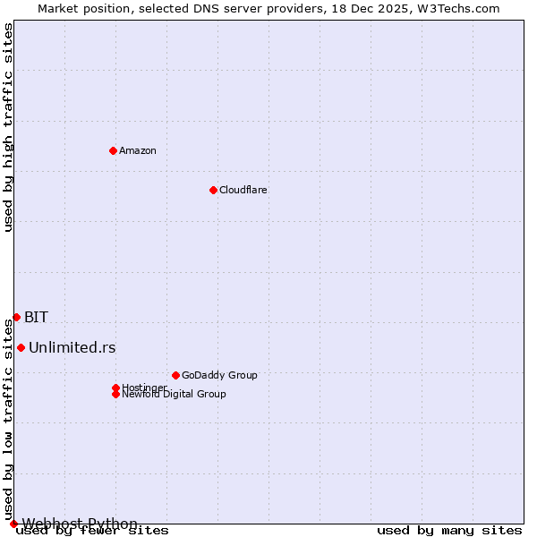 TechnologiesContent ManagementServer-side Languages Client-side Languages JavaScript Libraries CSS Frameworks Web Servers Web Panels Operating Systems Web Hosting Data Centers Reverse Proxies DNS Servers Email Servers SSL Certificate Authorities Content Delivery Traffic Analysis Tools Advertising Networks Tag Managers Social Widgets Site Elements Structured Data Markup Languages Character Encodings Image File Formats Top Level Domains Server Locations Content Languages | Technologies > DNS Servers > Technology usage comparison Comparison of the usage statistics of Unlimited.rs vs. BIT vs. Webhost Python for websitesThis report shows the usage statistics of Unlimited.rs vs. BIT vs. Webhost Python as DNS server provider on the web. See technologies overview for explanations on the methodologies used in the surveys. Our reports are updated daily. UsageThis diagram shows the percentages of websites using the selected technologies. How to read the diagram: