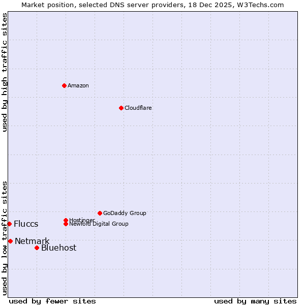 TechnologiesContent ManagementServer-side Languages Client-side Languages JavaScript Libraries CSS Frameworks Web Servers Web Panels Operating Systems Web Hosting Data Centers Reverse Proxies DNS Servers Email Servers SSL Certificate Authorities Content Delivery Traffic Analysis Tools Advertising Networks Tag Managers Social Widgets Site Elements Structured Data Markup Languages Character Encodings Image File Formats Top Level Domains Server Locations Content Languages | Technologies > DNS Servers > Technology usage comparison Comparison of the usage statistics of Bluehost vs. Netmark vs. Fluccs for websitesThis report shows the usage statistics of Bluehost vs. Netmark vs. Fluccs as DNS server provider on the web. See technologies overview for explanations on the methodologies used in the surveys. Our reports are updated daily. UsageThis diagram shows the percentages of websites using the selected technologies. How to read the diagram: