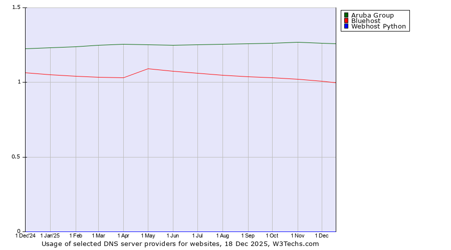 TechnologiesContent ManagementServer-side Languages Client-side Languages JavaScript Libraries CSS Frameworks Web Servers Web Panels Operating Systems Web Hosting Data Centers Reverse Proxies DNS Servers Email Servers SSL Certificate Authorities Content Delivery Traffic Analysis Tools Advertising Networks Tag Managers Social Widgets Site Elements Structured Data Markup Languages Character Encodings Image File Formats Top Level Domains Server Locations Content Languages | Technologies > DNS Servers > Technology usage comparison Comparison of the usage statistics of Aruba Group vs. Bluehost vs. Webhost Python for websitesThis report shows the usage statistics of Aruba Group vs. Bluehost vs. Webhost Python as DNS server provider on the web. See technologies overview for explanations on the methodologies used in the surveys. Our reports are updated daily. UsageThis diagram shows the percentages of websites using the selected technologies. How to read the diagram:
