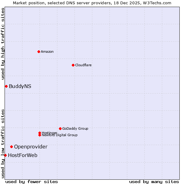 TechnologiesContent ManagementServer-side Languages Client-side Languages JavaScript Libraries CSS Frameworks Web Servers Web Panels Operating Systems Web Hosting Data Centers Reverse Proxies DNS Servers Email Servers SSL Certificate Authorities Content Delivery Traffic Analysis Tools Advertising Networks Tag Managers Social Widgets Site Elements Structured Data Markup Languages Character Encodings Image File Formats Top Level Domains Server Locations Content Languages | Technologies > DNS Servers > Technology usage comparison Comparison of the usage statistics of Openprovider vs. BuddyNS vs. HostForWeb for websitesThis report shows the usage statistics of Openprovider vs. BuddyNS vs. HostForWeb as DNS server provider on the web. See technologies overview for explanations on the methodologies used in the surveys. Our reports are updated daily. UsageThis diagram shows the percentages of websites using the selected technologies. How to read the diagram: