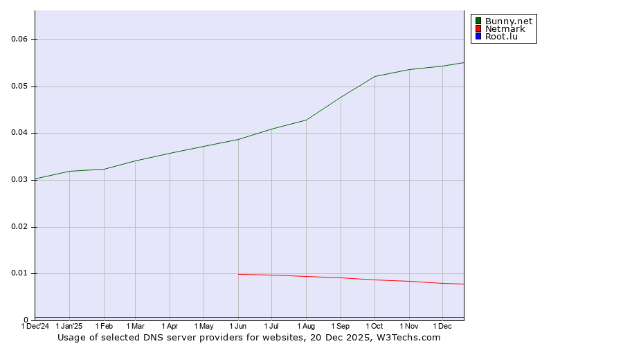 TechnologiesContent ManagementServer-side Languages Client-side Languages JavaScript Libraries CSS Frameworks Web Servers Web Panels Operating Systems Web Hosting Data Centers Reverse Proxies DNS Servers Email Servers SSL Certificate Authorities Content Delivery Traffic Analysis Tools Advertising Networks Tag Managers Social Widgets Site Elements Structured Data Markup Languages Character Encodings Image File Formats Top Level Domains Server Locations Content Languages | Technologies > DNS Servers > Technology usage comparison Comparison of the usage statistics of Bunny.net vs. Netmark vs. Root.lu for websitesThis report shows the usage statistics of Bunny.net vs. Netmark vs. Root.lu as DNS server provider on the web. See technologies overview for explanations on the methodologies used in the surveys. Our reports are updated daily. UsageThis diagram shows the percentages of websites using the selected technologies. How to read the diagram:
