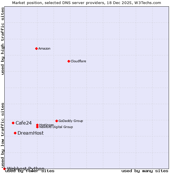 TechnologiesContent ManagementServer-side Languages Client-side Languages JavaScript Libraries CSS Frameworks Web Servers Web Panels Operating Systems Web Hosting Data Centers Reverse Proxies DNS Servers Email Servers SSL Certificate Authorities Content Delivery Traffic Analysis Tools Advertising Networks Tag Managers Social Widgets Site Elements Structured Data Markup Languages Character Encodings Image File Formats Top Level Domains Server Locations Content Languages | Technologies > DNS Servers > Technology usage comparison Comparison of the usage statistics of DreamHost vs. Cafe24 vs. Webhost Python for websitesThis report shows the usage statistics of DreamHost vs. Cafe24 vs. Webhost Python as DNS server provider on the web. See technologies overview for explanations on the methodologies used in the surveys. Our reports are updated daily. UsageThis diagram shows the percentages of websites using the selected technologies. How to read the diagram: