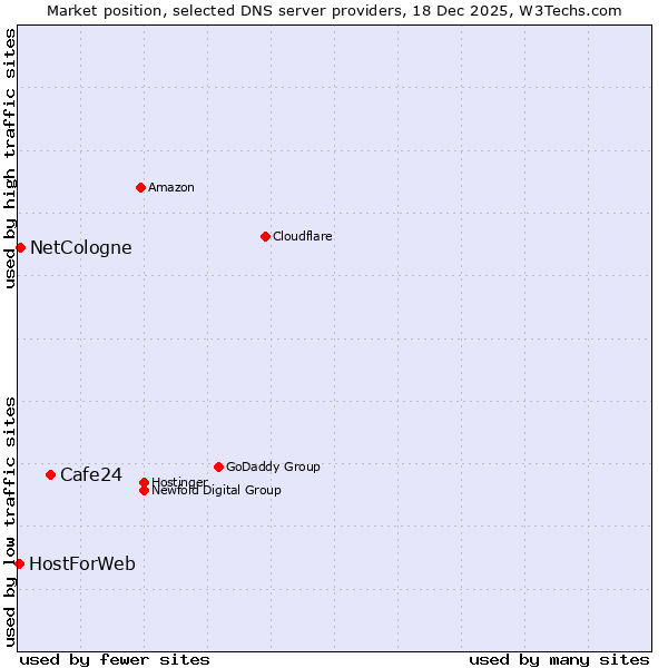 TechnologiesContent ManagementServer-side Languages Client-side Languages JavaScript Libraries CSS Frameworks Web Servers Web Panels Operating Systems Web Hosting Data Centers Reverse Proxies DNS Servers Email Servers SSL Certificate Authorities Content Delivery Traffic Analysis Tools Advertising Networks Tag Managers Social Widgets Site Elements Structured Data Markup Languages Character Encodings Image File Formats Top Level Domains Server Locations Content Languages | Technologies > DNS Servers > Technology usage comparison Comparison of the usage statistics of Cafe24 vs. NetCologne vs. HostForWeb for websitesThis report shows the usage statistics of Cafe24 vs. NetCologne vs. HostForWeb as DNS server provider on the web. See technologies overview for explanations on the methodologies used in the surveys. Our reports are updated daily. UsageThis diagram shows the percentages of websites using the selected technologies. How to read the diagram: