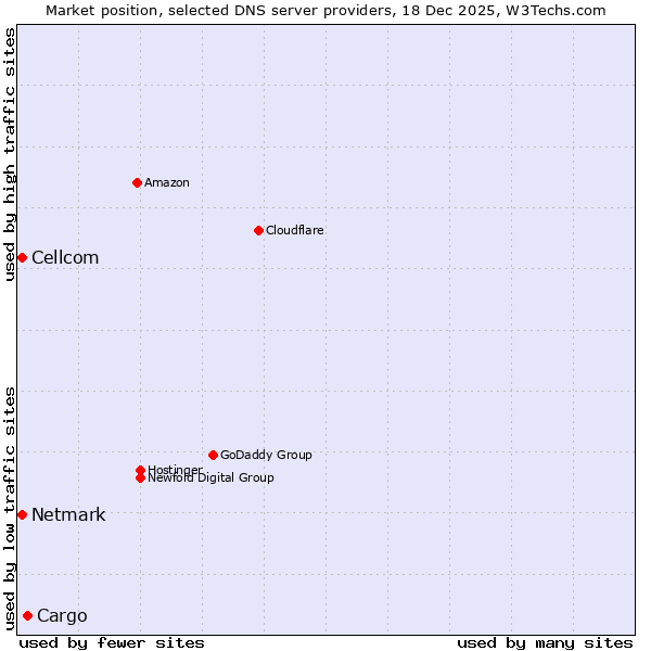 TechnologiesContent ManagementServer-side Languages Client-side Languages JavaScript Libraries CSS Frameworks Web Servers Web Panels Operating Systems Web Hosting Data Centers Reverse Proxies DNS Servers Email Servers SSL Certificate Authorities Content Delivery Traffic Analysis Tools Advertising Networks Tag Managers Social Widgets Site Elements Structured Data Markup Languages Character Encodings Image File Formats Top Level Domains Server Locations Content Languages | Technologies > DNS Servers > Technology usage comparison Comparison of the usage statistics of Cargo vs. Netmark vs. Cellcom for websitesThis report shows the usage statistics of Cargo vs. Netmark vs. Cellcom as DNS server provider on the web. See technologies overview for explanations on the methodologies used in the surveys. Our reports are updated daily. UsageThis diagram shows the percentages of websites using the selected technologies. How to read the diagram:
