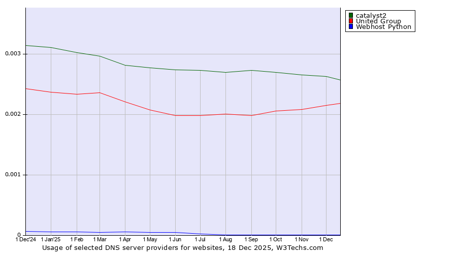 TechnologiesContent ManagementServer-side Languages Client-side Languages JavaScript Libraries CSS Frameworks Web Servers Web Panels Operating Systems Web Hosting Data Centers Reverse Proxies DNS Servers Email Servers SSL Certificate Authorities Content Delivery Traffic Analysis Tools Advertising Networks Tag Managers Social Widgets Site Elements Structured Data Markup Languages Character Encodings Image File Formats Top Level Domains Server Locations Content Languages | Technologies > DNS Servers > Technology usage comparison Comparison of the usage statistics of catalyst2 vs. United Group vs. Webhost Python for websitesThis report shows the usage statistics of catalyst2 vs. United Group vs. Webhost Python as DNS server provider on the web. See technologies overview for explanations on the methodologies used in the surveys. Our reports are updated daily. UsageThis diagram shows the percentages of websites using the selected technologies. How to read the diagram: