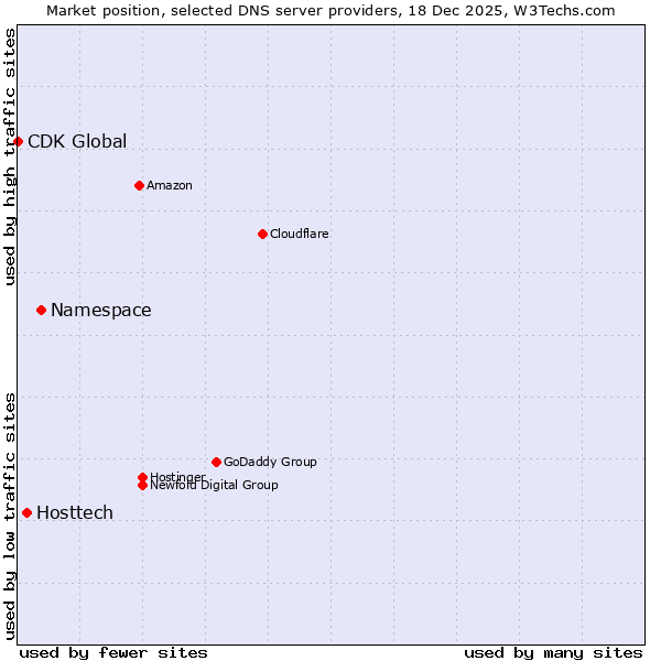 TechnologiesContent ManagementServer-side Languages Client-side Languages JavaScript Libraries CSS Frameworks Web Servers Web Panels Operating Systems Web Hosting Data Centers Reverse Proxies DNS Servers Email Servers SSL Certificate Authorities Content Delivery Traffic Analysis Tools Advertising Networks Tag Managers Social Widgets Site Elements Structured Data Markup Languages Character Encodings Image File Formats Top Level Domains Server Locations Content Languages | Technologies > DNS Servers > Technology usage comparison Comparison of the usage statistics of Namespace vs. Hosttech vs. CDK Global for websitesThis report shows the usage statistics of Namespace vs. Hosttech vs. CDK Global as DNS server provider on the web. See technologies overview for explanations on the methodologies used in the surveys. Our reports are updated daily. UsageThis diagram shows the percentages of websites using the selected technologies. How to read the diagram: