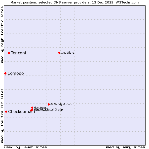TechnologiesContent ManagementServer-side Languages Client-side Languages JavaScript Libraries CSS Frameworks Web Servers Web Panels Operating Systems Web Hosting Data Centers Reverse Proxies DNS Servers Email Servers SSL Certificate Authorities Content Delivery Traffic Analysis Tools Advertising Networks Tag Managers Social Widgets Site Elements Structured Data Markup Languages Character Encodings Image File Formats Top Level Domains Server Locations Content Languages | Technologies > DNS Servers > Technology usage comparison Comparison of the usage statistics of Tencent vs. Checkdomain vs. Comodo for websitesThis report shows the usage statistics of Tencent vs. Checkdomain vs. Comodo as DNS server provider on the web. See technologies overview for explanations on the methodologies used in the surveys. Our reports are updated daily. UsageThis diagram shows the percentages of websites using the selected technologies. How to read the diagram: