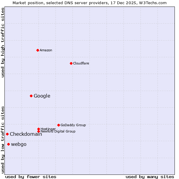 TechnologiesContent ManagementServer-side Languages Client-side Languages JavaScript Libraries CSS Frameworks Web Servers Web Panels Operating Systems Web Hosting Data Centers Reverse Proxies DNS Servers Email Servers SSL Certificate Authorities Content Delivery Traffic Analysis Tools Advertising Networks Tag Managers Social Widgets Site Elements Structured Data Markup Languages Character Encodings Image File Formats Top Level Domains Server Locations Content Languages | Technologies > DNS Servers > Technology usage comparison Comparison of the usage statistics of Google vs. webgo vs. Checkdomain for websitesThis report shows the usage statistics of Google vs. webgo vs. Checkdomain as DNS server provider on the web. See technologies overview for explanations on the methodologies used in the surveys. Our reports are updated daily. UsageThis diagram shows the percentages of websites using the selected technologies. How to read the diagram: