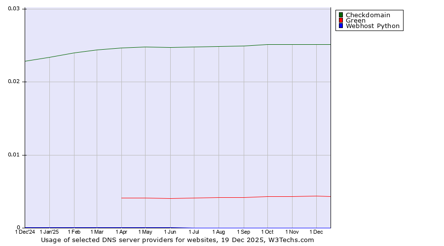 TechnologiesContent ManagementServer-side Languages Client-side Languages JavaScript Libraries CSS Frameworks Web Servers Web Panels Operating Systems Web Hosting Data Centers Reverse Proxies DNS Servers Email Servers SSL Certificate Authorities Content Delivery Traffic Analysis Tools Advertising Networks Tag Managers Social Widgets Site Elements Structured Data Markup Languages Character Encodings Image File Formats Top Level Domains Server Locations Content Languages | Technologies > DNS Servers > Technology usage comparison Comparison of the usage statistics of Checkdomain vs. Green vs. Webhost Python for websitesThis report shows the usage statistics of Checkdomain vs. Green vs. Webhost Python as DNS server provider on the web. See technologies overview for explanations on the methodologies used in the surveys. Our reports are updated daily. UsageThis diagram shows the percentages of websites using the selected technologies. How to read the diagram:
