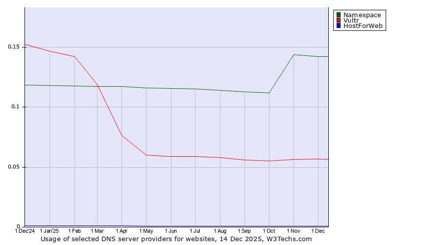 TechnologiesContent ManagementServer-side Languages Client-side Languages JavaScript Libraries CSS Frameworks Web Servers Web Panels Operating Systems Web Hosting Data Centers Reverse Proxies DNS Servers Email Servers SSL Certificate Authorities Content Delivery Traffic Analysis Tools Advertising Networks Tag Managers Social Widgets Site Elements Structured Data Markup Languages Character Encodings Image File Formats Top Level Domains Server Locations Content Languages | Technologies > DNS Servers > Technology usage comparison Comparison of the usage statistics of Namespace vs. Vultr vs. HostForWeb for websitesThis report shows the usage statistics of Namespace vs. Vultr vs. HostForWeb as DNS server provider on the web. See technologies overview for explanations on the methodologies used in the surveys. Our reports are updated daily. UsageThis diagram shows the percentages of websites using the selected technologies. How to read the diagram: